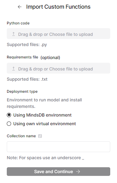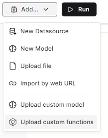 You can upload your custom functions via the MindsDB editor by clickingAdd and Upload custom functions, like this: