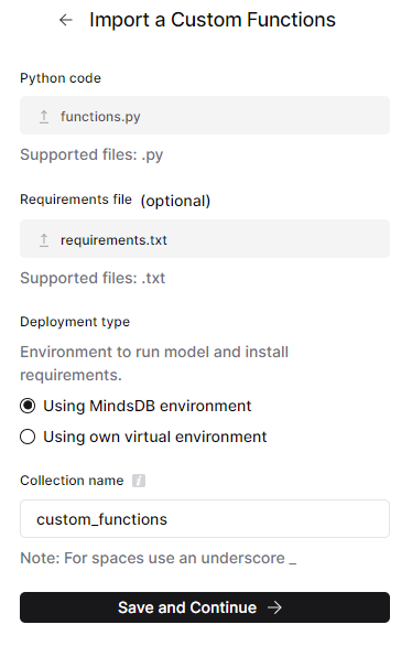 functions.py file that stores an implementation of the functions and the requirements.txt file that stores all the dependencies. We named the storage collection as custom_functions.