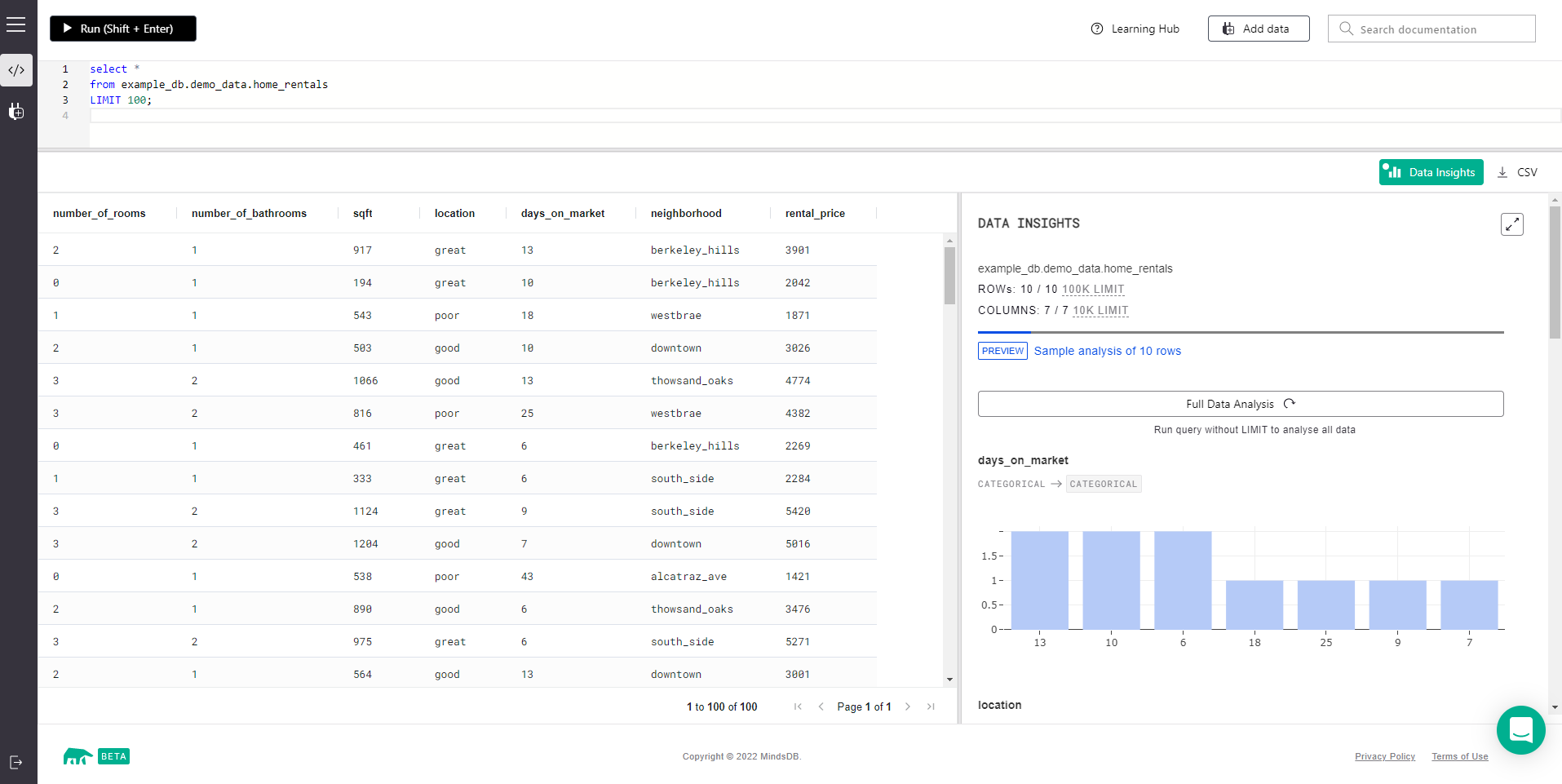 Let’s do a full data analysis step by step. First, we need to query data for analysis in the MindsDB editor. Please note that you need to query your dataset without using aLIMIT keyword to be