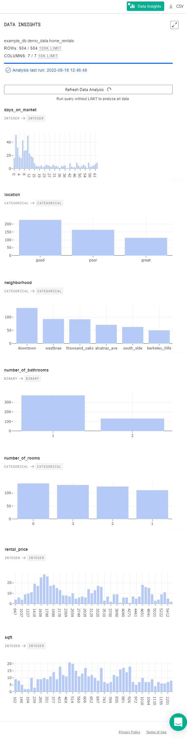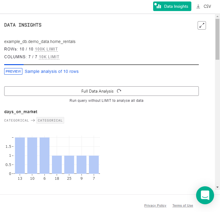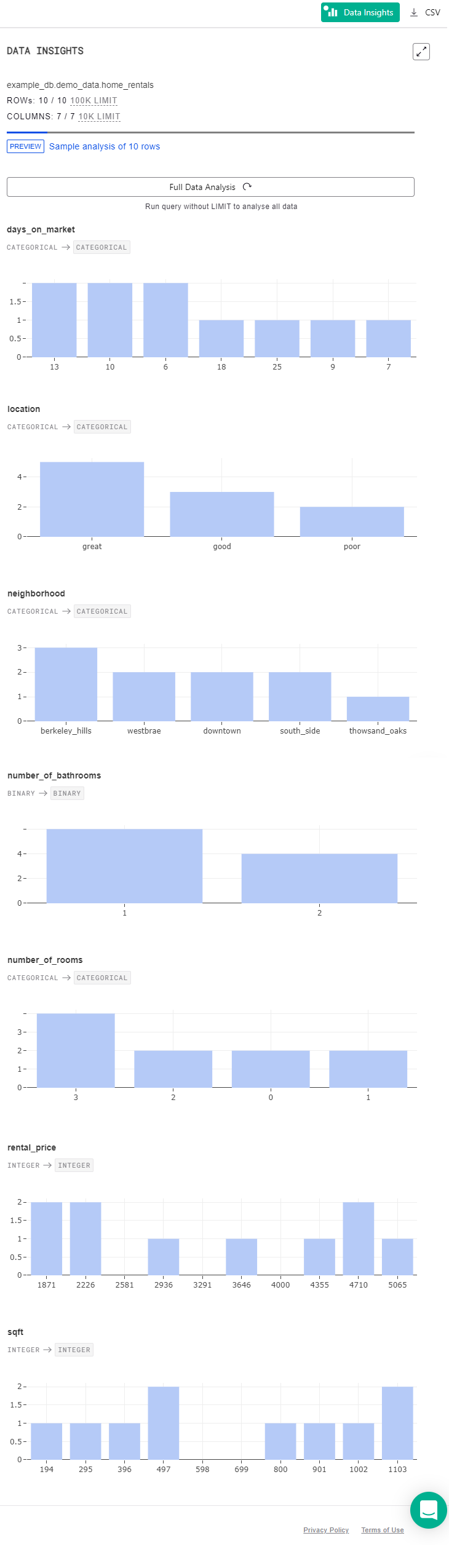 When opening the Data Insights pane, you see the distribution of data of each output dataset column. Initially, the visualization and analysis of the first ten rows is shown, as below.
